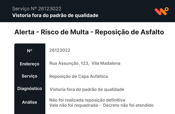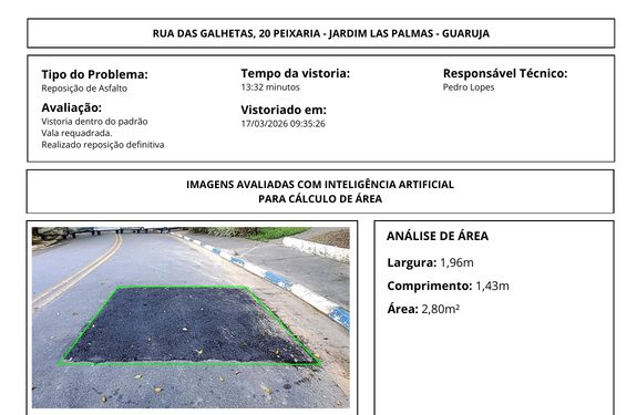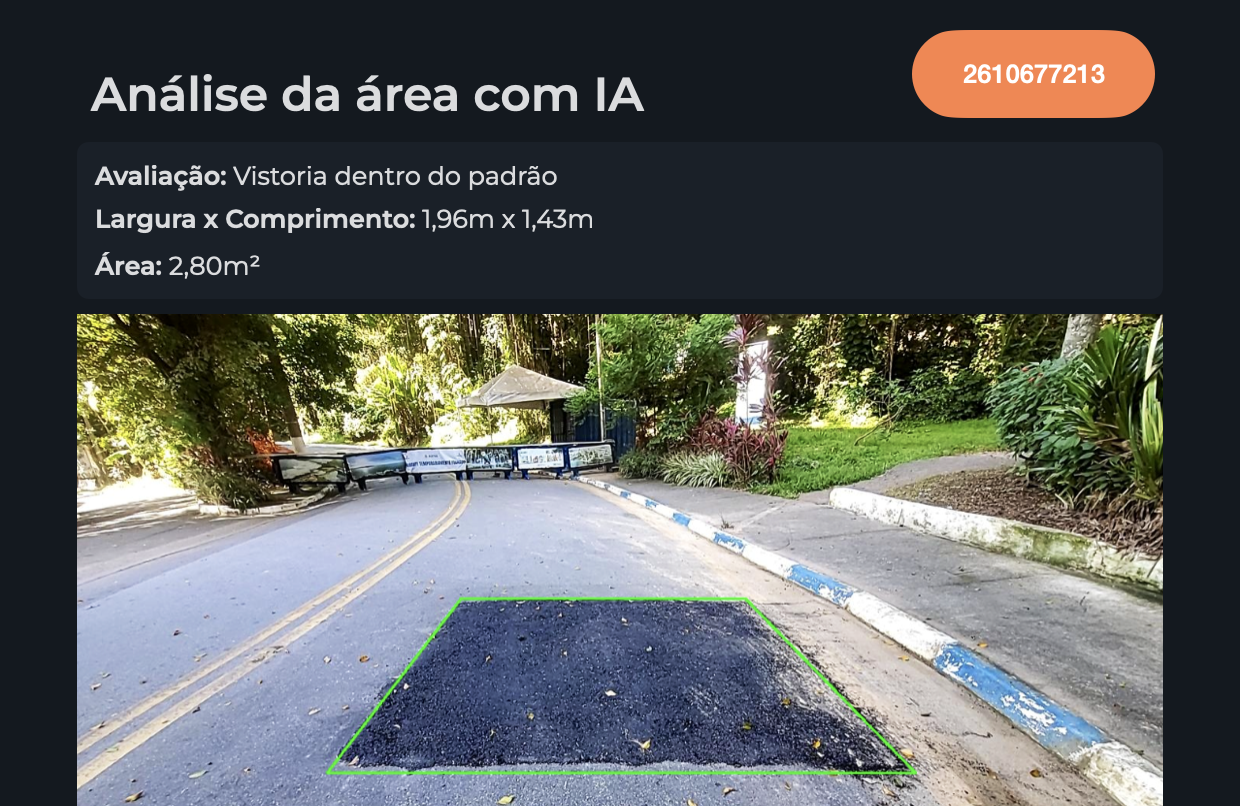 A inteligência artificial analisa imagens e identifica inconformidades automaticamente, extraindo medidas e padrões técnicos, como área de recomposição de pavimento e nivelamento.